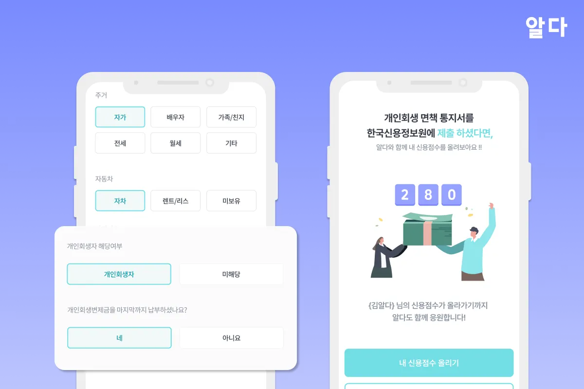 알다 앱은 누적 다운로드 146만 회, 누적 대출 승인금액 10조원의 대출 비교 플랫폼으로 신용점수를 높일 수 있는 핀테크 앱이다.